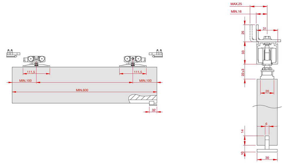 Ensemble de ferrures pour une porte battante avec frein, sans amortisseur. Roulettes tournées sans roulement a billes. Capacité de charge des portes - max. 80 kg. L'ensemble comprend la quincaillerie pour 1 battant sans fixations murales. Largeur minimale du battant 600 mm. Montage et démontage faciles, avec un réglage de la hauteur du battant encore plus simple que dans la version Classic d'origine. Les supports du chariot peuvent etre fraisés, ce qui réduit l'écart entre les portes et le guidage supérieur jusqu'a 11 mm.