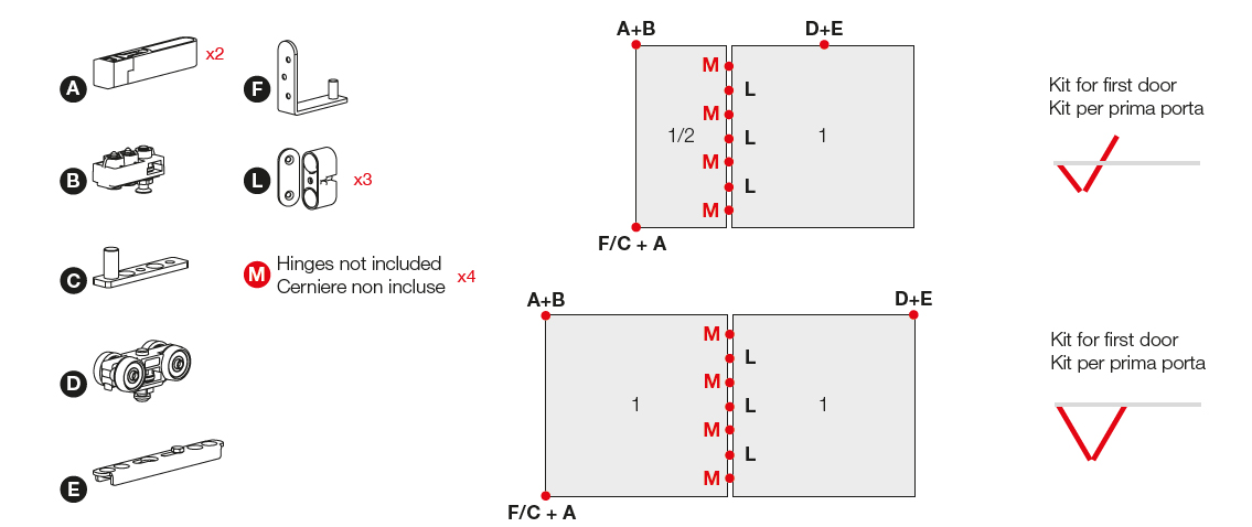 Ensemble de ferrures pour premiere double porte. Comprend trois butées magnétiques, sans charnieres pliantes ni charnieres intermédiaires. Version sans guidage inférieur. Pour une hauteur de porte max. 3000 mm, capacité de charge 80 kg/1 vantail. En cas de quatre portes - 40 kg/1 vantail, six portes - 25 - 30 kg/1 vantail. Épaisseur du matériau 35 - 45 mm. Couleur noire (peinture en poudre).