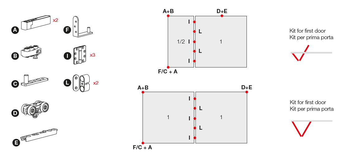 Ensemble de ferrures pour le premier vantail double. Comprend deux arret magnétiques et trois charnieres intermédiaires. Version sans guidage inférieur. Pour une hauteur de porte max. 2400mm, capacité de charge 80kg/1 vantail. En cas de quatre portes - 40kg/1 vantail, six portes - 25 - 30kg/1 vantail. Épaisseur du matériau 35 - 45mm. Couleur noire (vernis en poudre).