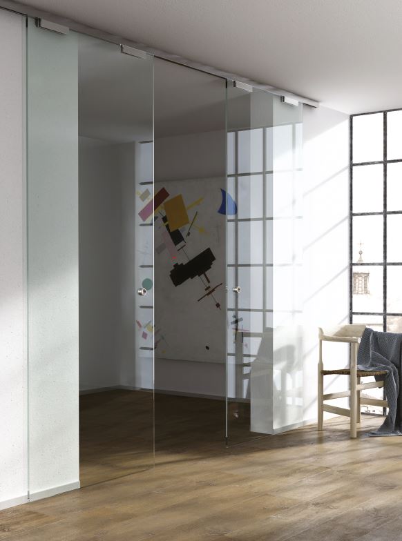 Ensemble de quincaillerie synchronisé et fixations pour 2 vantaux pour une épaisseur de verre de 10 - 10,7 mm.