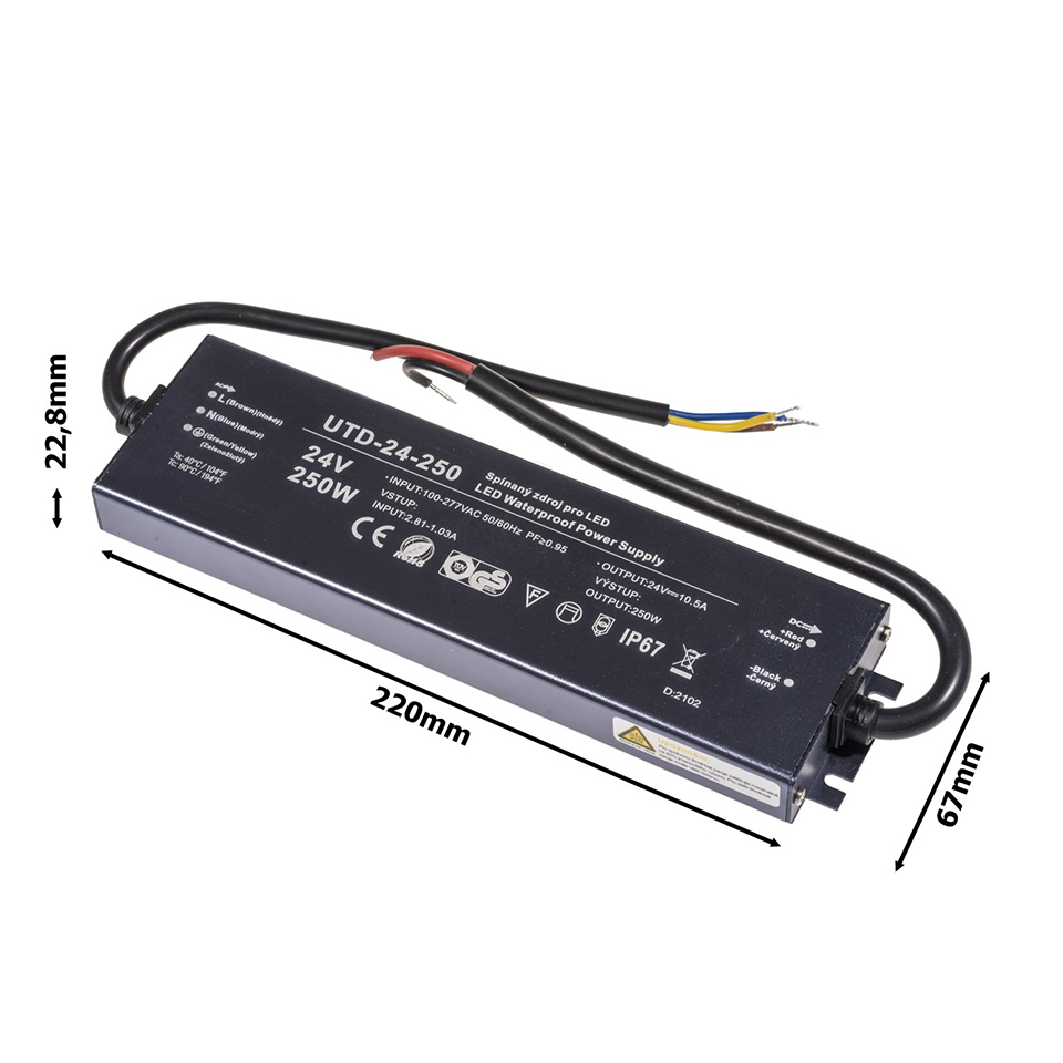 Source LED pour bandes LED 24V 250W est équipé de : protection thermique, fusible contre les courts-circuits (apres suppression du court-circuit, la fonction est de nouveau pleinement opérationnelle), fusible contre la surcharge. Source électronique a découpage étanche avec protection IP67. Spécifications de la source LED Tension d'entrée : 100 - 277 VAC. Tension de sortie : 24V DC/10,5A. Puissance : 250W*. Protection : IP67. Dimensions : 220×67×22,8mm. * !!! Attention !!! la charge maximale recommandée en usage continu inclut une marge d’au moins 20% pour un usage ordinaire, pour une installation dans des locaux commerciaux avec une utilisation continue de 8 heures ou plus par jour, la charge continue recommandée, compte tenu du rendement des sources a découpage, doit introduire une marge d’au moins 30% afin d’assurer la plus longue durée de vie possible de la source.