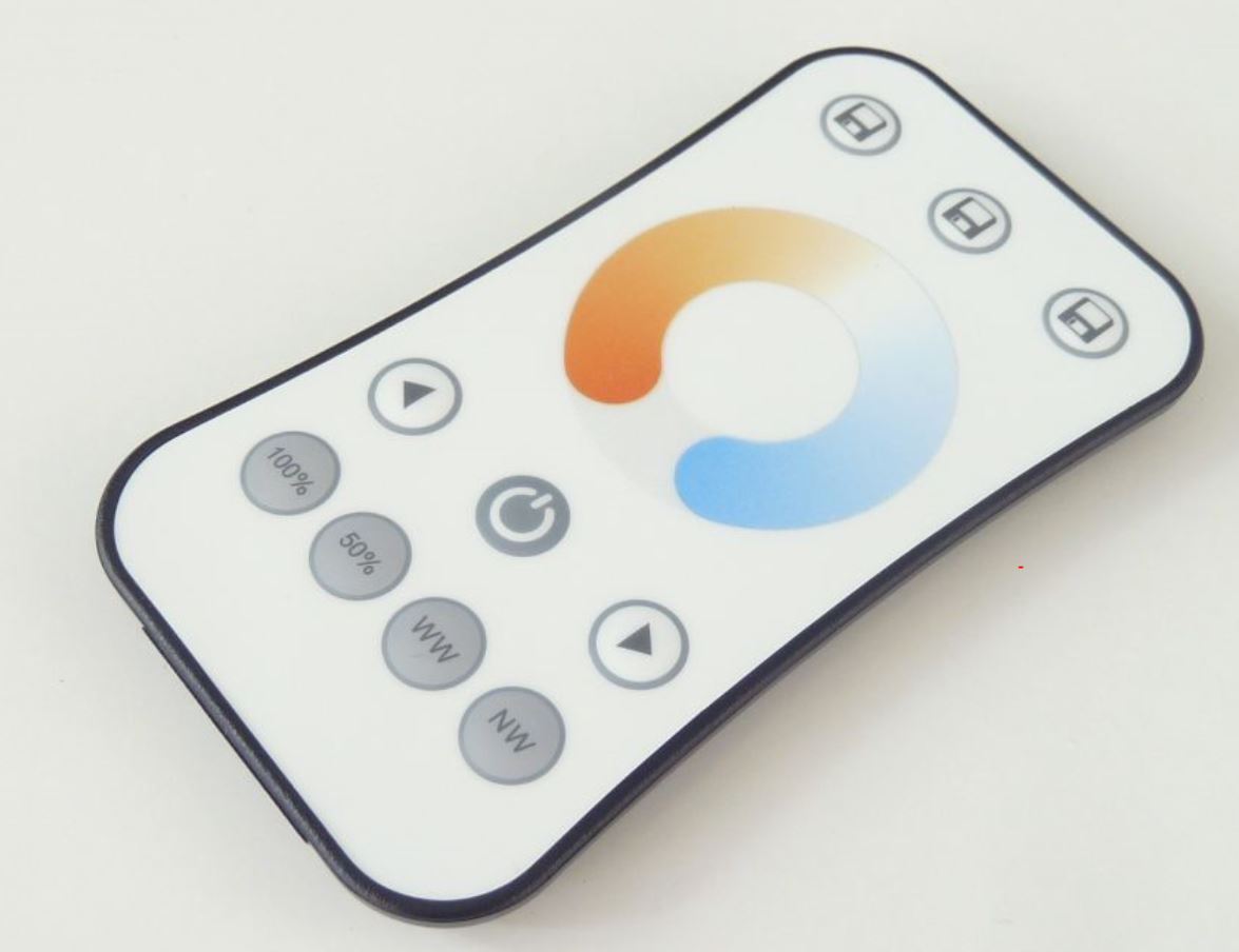 Ensemble radiofréquence de contrôleur et récepteur pour produits LED, la visibilité directe sur le récepteur n’est pas nécessaire. Contrôleur LED avec technologie de commande PWM destiné aux bandes bicolores CCT, utilisé pour allumer, éteindre, réguler l’intensité et éventuellement lancer des effets lumineux. Plusieurs récepteurs peuvent etre appairés sur un seul contrôleur pour chaque présélection. Un récepteur peut etre appairé avec un maximum de 2 contrôleurs. Étant donné qu’il s’agit d’un appareil électronique avec commande radiofréquence, il peut arriver que le contrôleur se désynchronise avec le récepteur. Cela peut etre causé par exemple par l’électricité statique, des interférences radiofréquence, une fluctuation de l’alimentation. Si votre contrôleur ne réagit plus, il est nécessaire de le réappairer avec le récepteur selon les instructions.