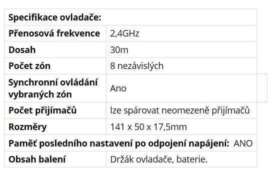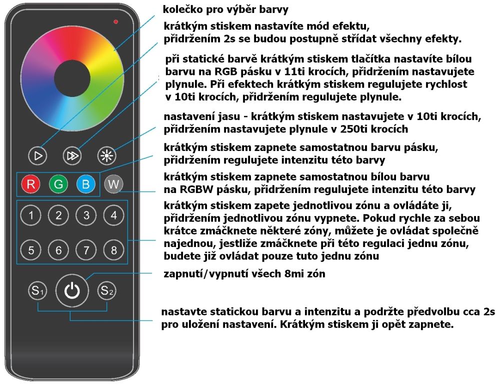 Télécommande dimLED OV RGBW 8KRXL est un systeme de contrôle radiofréquence sans fil, composé d'une télécommande et de plusieurs récepteurs. Avec une seule télécommande, il est possible de contrôler indépendamment 8 zones, qui peuvent etre composées de plusieurs récepteurs. Ces récepteurs, une fois appairés a une certaine préselection sur la télécommande, sont contrôlés comme une seule section. La télécommande peut etre utilisée pour des bandes RGB avec un récepteur RGB ou pour des bandes RGBW avec un récepteur RGBW. Le récepteur peut etre dissimulé (derriere un mur, du placoplâtre ou dans un meuble), aucune visibilité directe du récepteur n'est nécessaire pour la télécommande. Caractéristiques et avantages du systeme dimLED : Le gradation est stable et fiable, portée de la télécommande 30M. Gradation de 0 a 100 %, 250 niveaux de gradation, gradation douce, sans scintillement. Lors de l'allumage, l'éclairage s'intensifie progressivement, a l'extinction, il diminue progressivement.