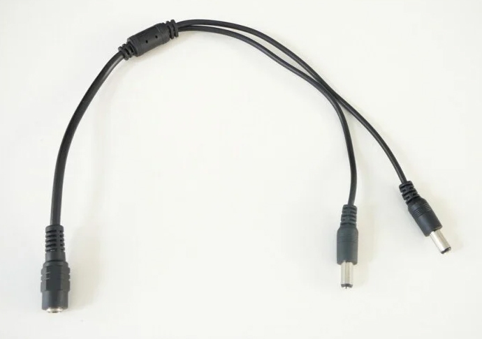 DC répartiteur avec 2 sorties. Dimension 2,1/5,5 mm. Longueur 40 cm. Charge maximale 5A a l'entrée, 3A sur chaque sortie du répartiteur.