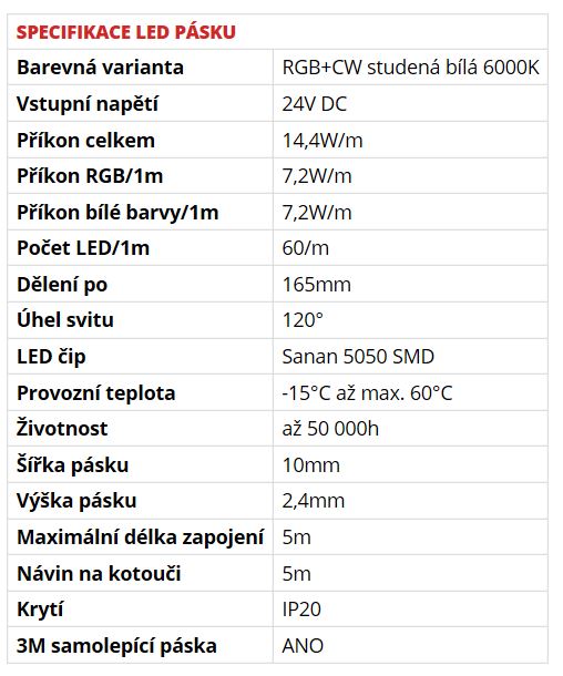 Le ruban LED RGB+CW 24V est une nouveauté combinant le RGB et une couleur unique sur un seul ruban, offrant les meilleures caractéristiques des rubans LED a tension. Garantie 3 ans Excellent rapport puissance lumineuse et rendu des couleurs (CRI>82). Construction de la puce : base en cuivre recouverte d'argent, connexion de la puce a la base par fil d'or. PCB double couche en cuivre (support des LED). Ruban adhésif 3M série 300 LSE auto-adhésif. Ce ruban alterne des puces LED RGB et mono-couleur.