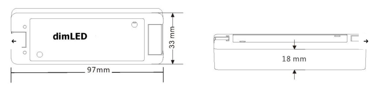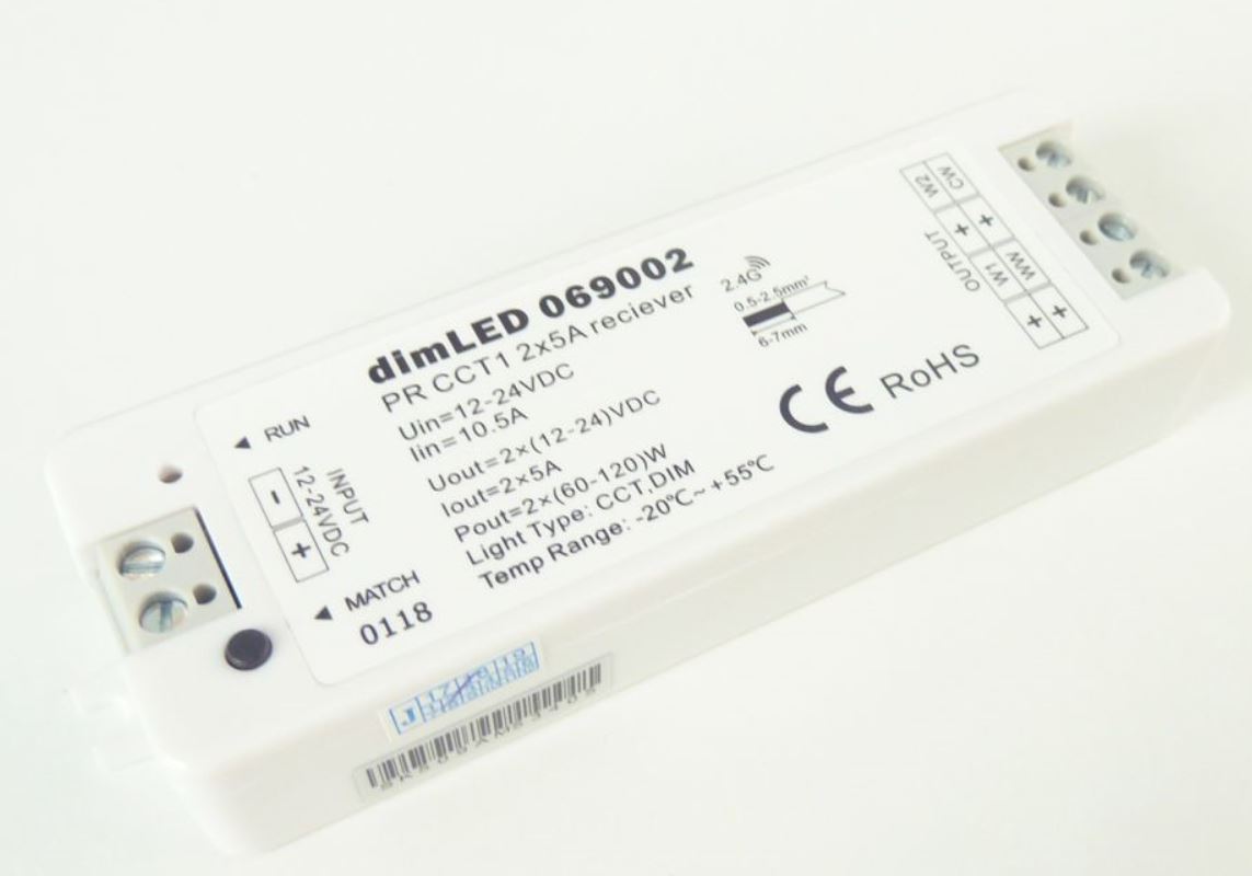 Récepteur radiofréquence variateur pour produits LED CCT. Le récepteur peut etre dissimulé (derriere un mur, du placoplâtre ou dans un meuble), il n’est pas nécessaire que le récepteur soit visible directement par le contrôleur. Le récepteur est compatible avec tous les contrôleurs CCT de la série dimLED !!! Pour commander plusieurs circuits, il faut utiliser un récepteur pour chaque circuit. Chaque récepteur peut etre appairé avec jusqu’a 10 contrôleurs différents de la série dimLED, permettant ainsi un contrôle depuis plusieurs endroits. En cas de coupure, puis de reconnexion de l’alimentation (par exemple, interruption de l’alimentation de la source), ce récepteur mémorise le réglage de l’intensité (l’intensité lumineuse revient au dernier réglage effectué). Spécifications du récepteur : Tension d'entrée 5-36VDC Charge maximale 1x8A (12V 96W, 24V 192W) Fréquence de transmission 2,4GHz Portée 30m a 100m Nombre de contrôleurs Peut etre appairé avec max. 10 pieces par 1 récepteur Dimensions 97 x 33 x 18mm Mémoire du dernier réglage apres coupure d’alimentation : OUI