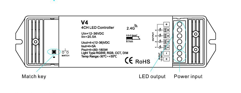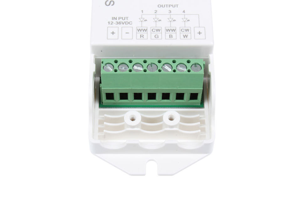 Récepteur radiofréquence variateur pour produits LED RGBW. Le récepteur peut etre dissimulé (derriere un mur, une cloison seche ou dans une armoire), la visibilité directe du récepteur pour le contrôleur n’est pas nécessaire. Le récepteur est compatible avec les contrôleurs RGBW de la série dimLED et avec le contrôleur monochrome OVL 4ALL. Pour commander plusieurs circuits, un récepteur doit etre utilisé par circuit. Jusqu’a 10 contrôleurs différents de la série dimLED peuvent etre appairés a chaque récepteur, permettant ainsi un contrôle depuis plusieurs endroits. En cas d’interruption puis de rétablissement de l’alimentation (par exemple coupure de l’alimentation de la source), ce récepteur mémorise le réglage d’intensité (l’intensité lumineuse revient au dernier réglage enregistré).