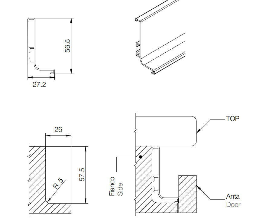 Profil Gola horizontal J pour application entre les tiroirs. L'utilisation du profil Gola remplace le type classique de poignée a reling et offre ainsi a la cuisine un aspect moderne sans poignées. Longueur : 4100mm. Lors de l'application, nous recommandons de combiner avec d'autres composants, embout ouvert ou fermé, et si nécessaire avec un angle - voir gamme associée.