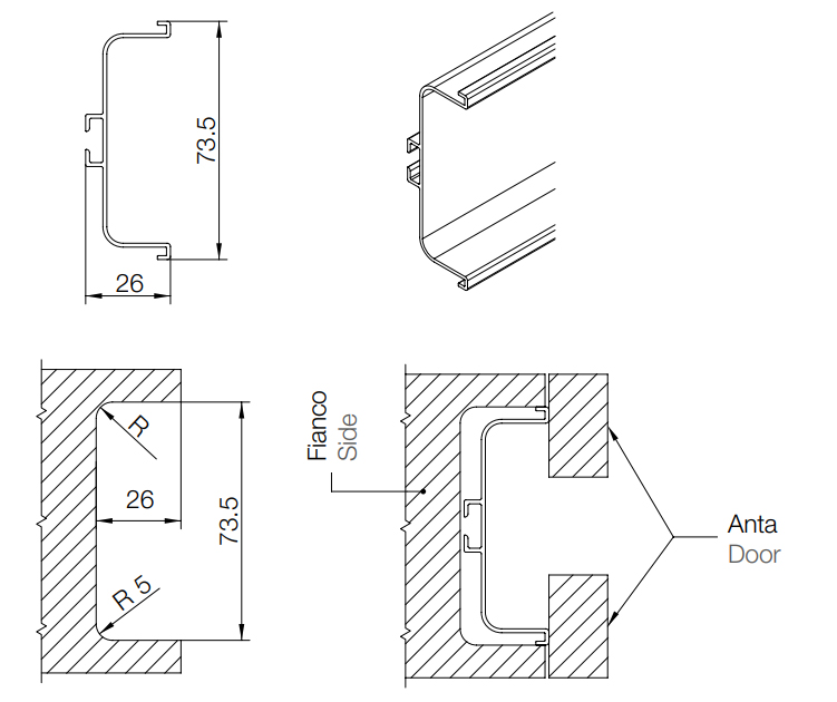 Profil horizontal Gola C pour application entre tiroirs. L'utilisation du profil Gola remplace le type classique de poignée reling et confere ainsi a la cuisine un aspect moderne sans poignées. Longueur : 4100mm. Lors de l'application, nous recommandons de combiner avec d'autres composants, embout ouvert ou fermé, et si nécessaire avec un angle - voir la gamme associée.