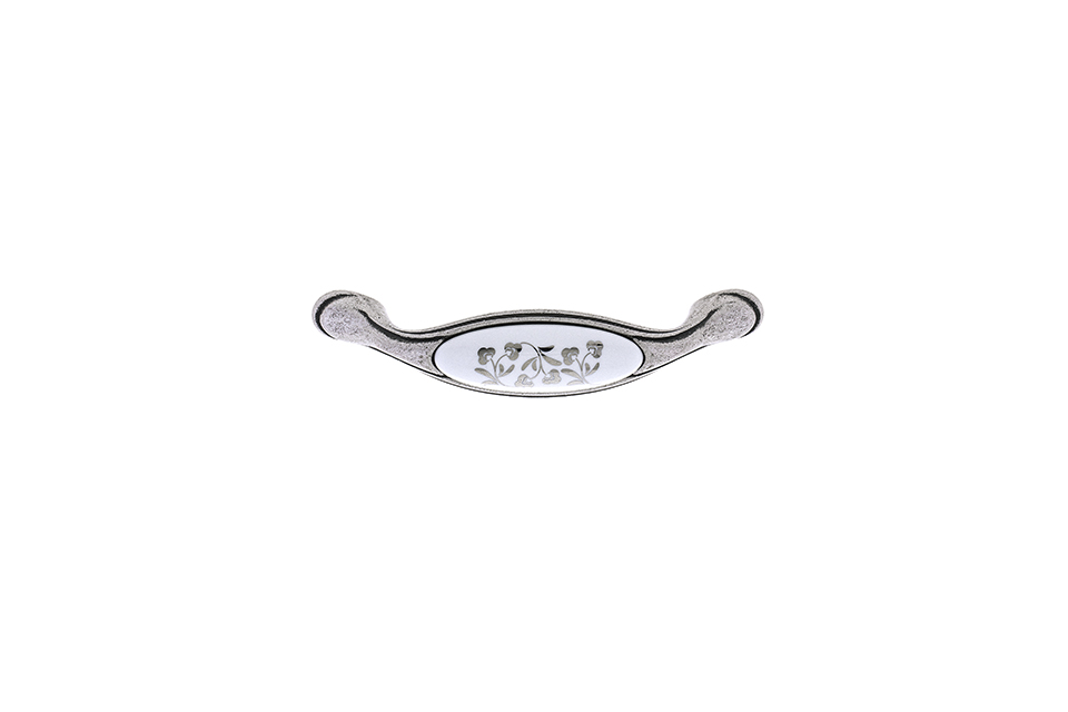 poignée finition argent vieilli / porcelaine blanche / petite fleur argentée, entraxe 96 mm, longueur 127 mm, largeur 26 mm, hauteur 36 mm. Vis non incluses. En stock a la semaine 33