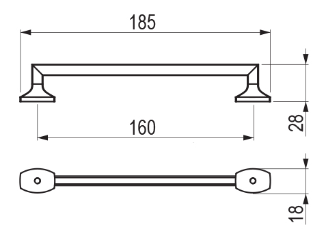 Poignée métallique avec entraxe de 160 mm, longueur totale 185 mm. Largeur : 18 mm Hauteur : 28 mm