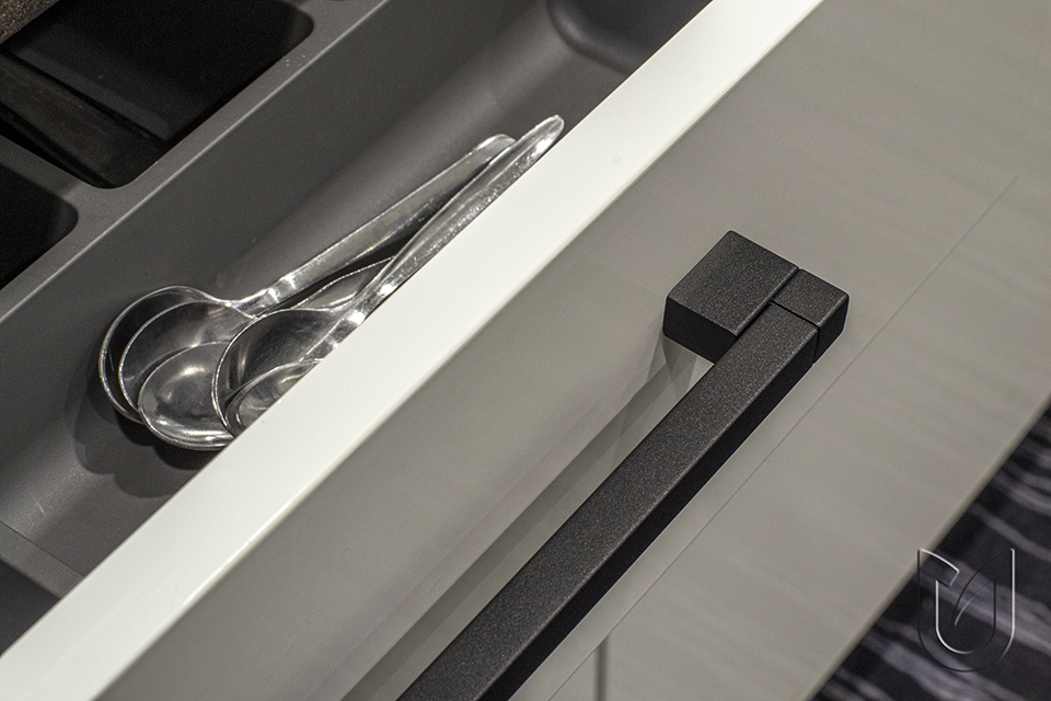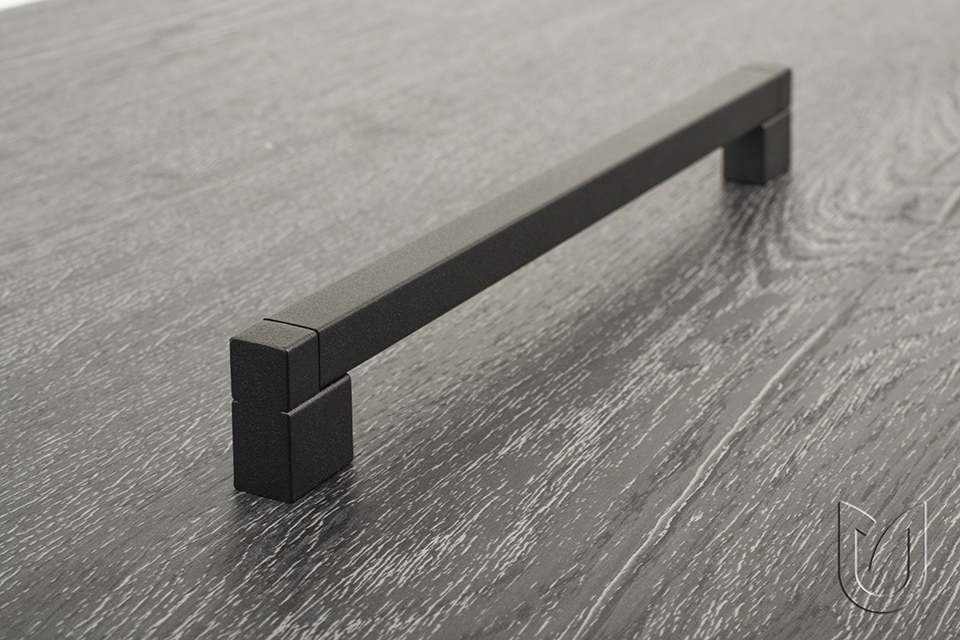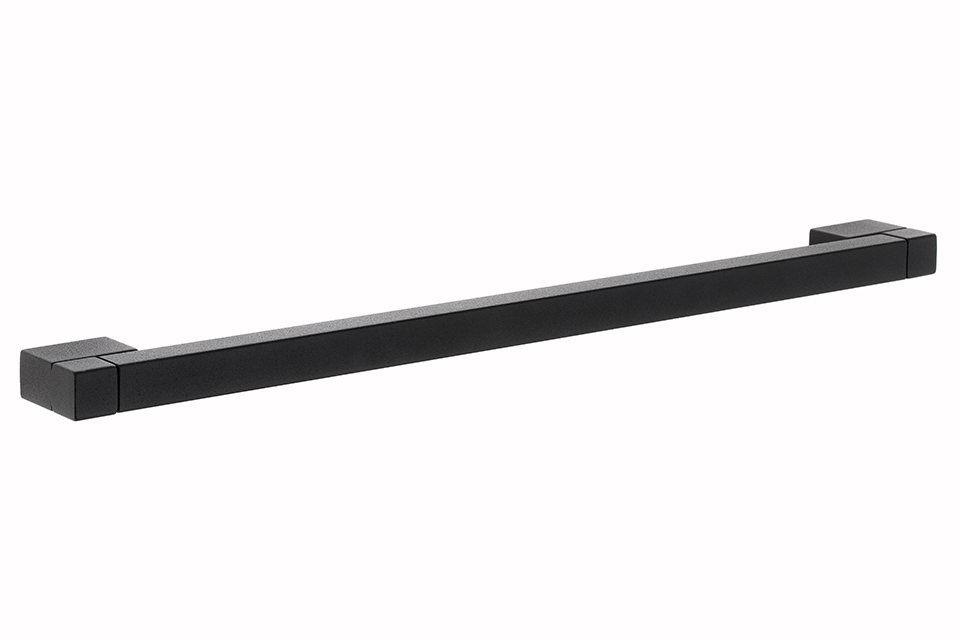 Poignée métallique noire mate. Longueur : 248 mm, entraxe : 224 mm, largeur : 12 mm, hauteur : 30 mm.