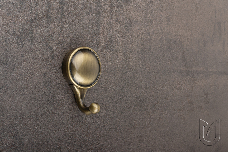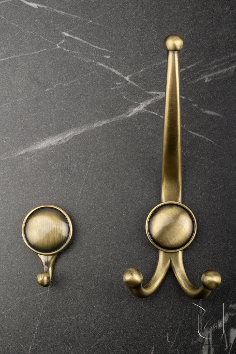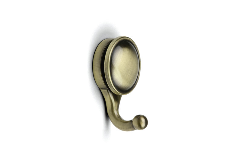 porte-manteau largeur 40 mm, hauteur 63 mm, longueur 32 mm, surface laiton ancien, montage frontal.
