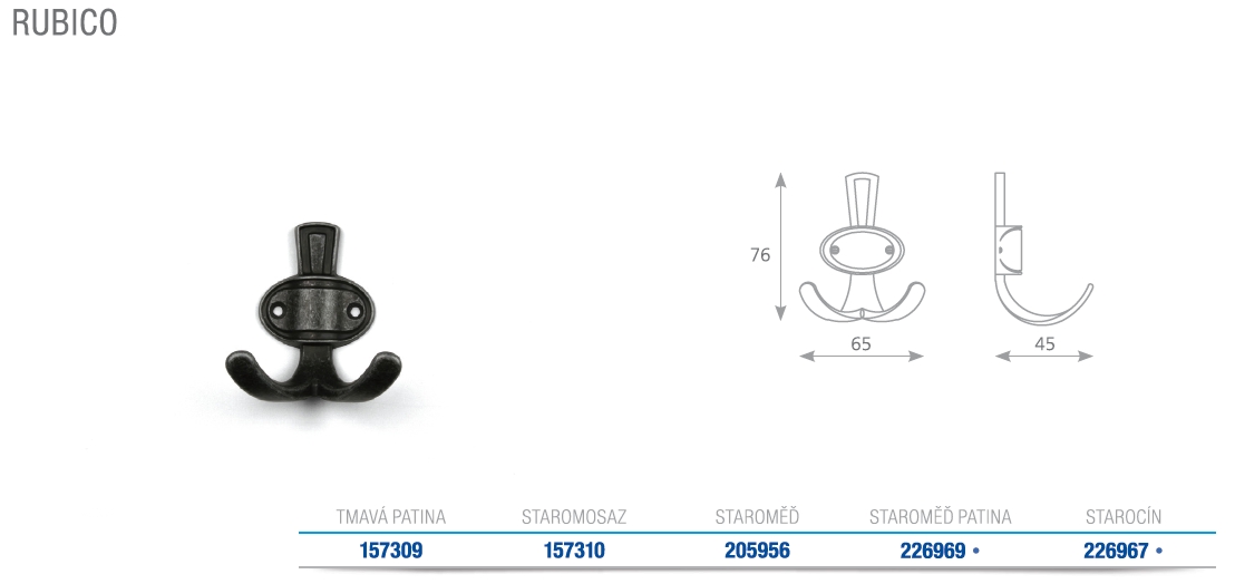 porte-manteau largeur 65 mm, hauteur 76, longueur 45 mm, surface métal patiné. Entraxe des vis - 32 mm.