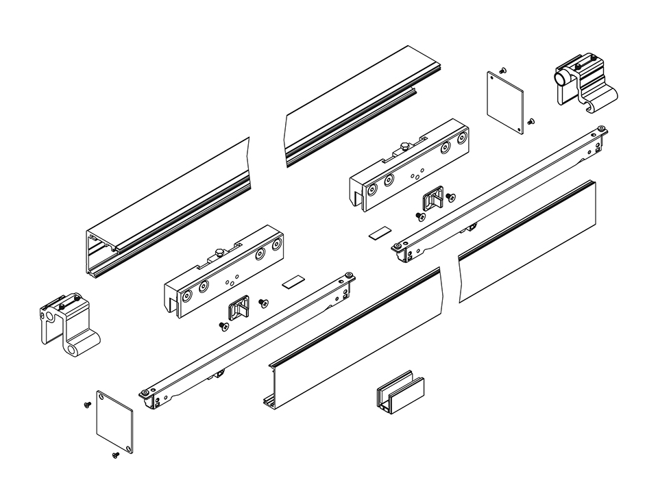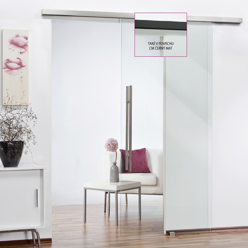 Ensemble de ferrures pour une porte incluant la conduite supérieure et la moulure de couverture. Version avec amortissement. Finition - aluminium anodisé, couleur inox.