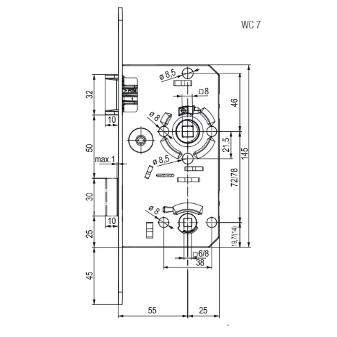Twin serrure a mortaiser gâche plastique verrou WC/78 mm droit