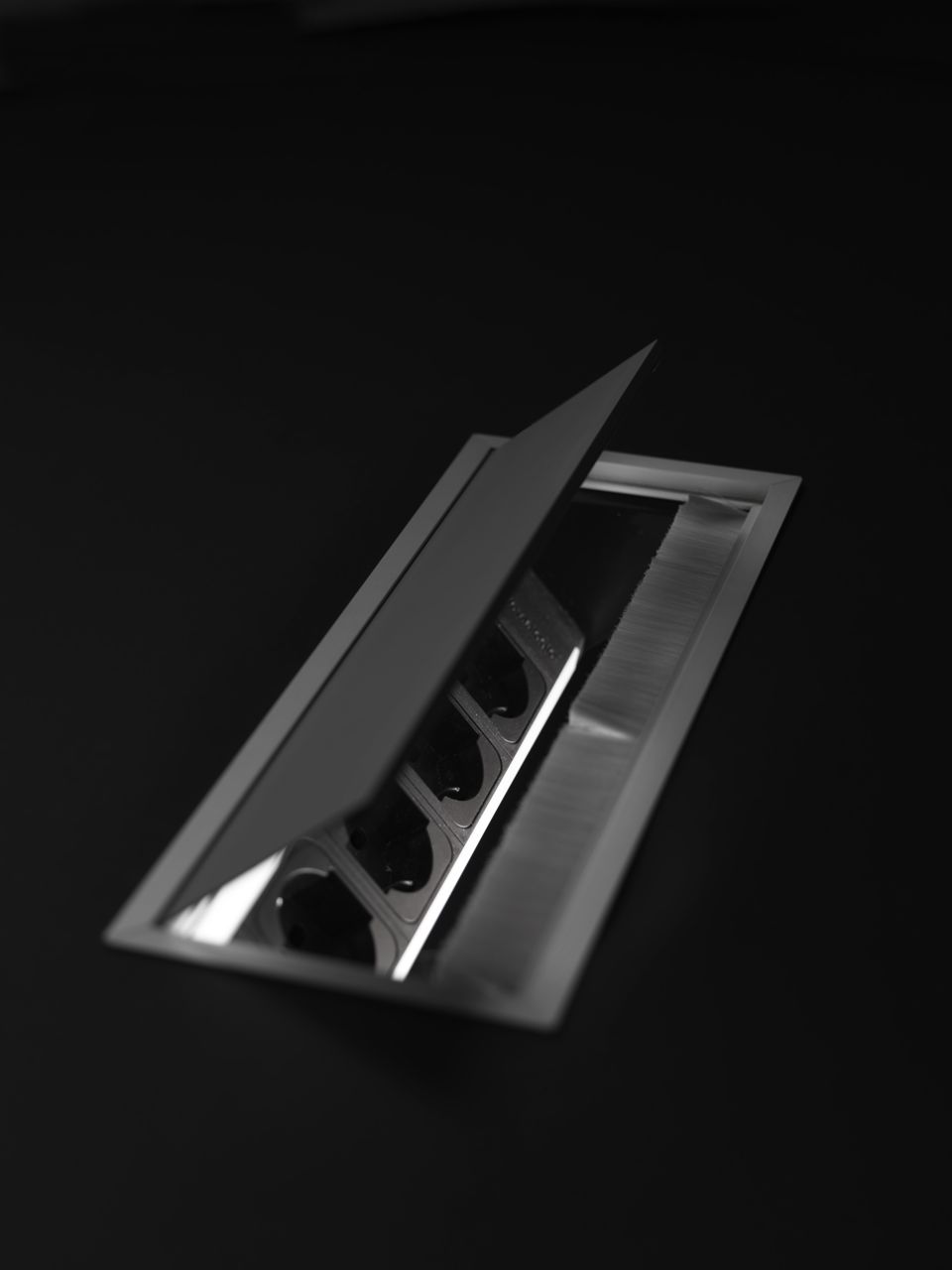 Systeme de bureau complet avec 4 tiroirs électriques, y compris passe-câble en aluminium 320x120 mm et fixation, généralement installé dans le plan de travail du bureau.