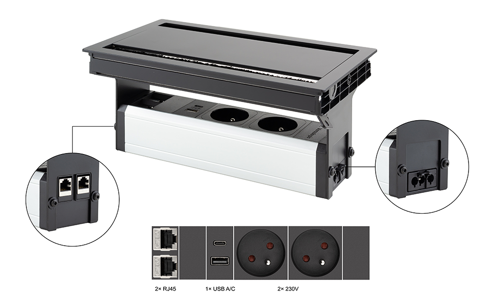 VersaFlap dual 2.0 prise électrique 2x 230V, FR, RJ45, USB A/C, noir