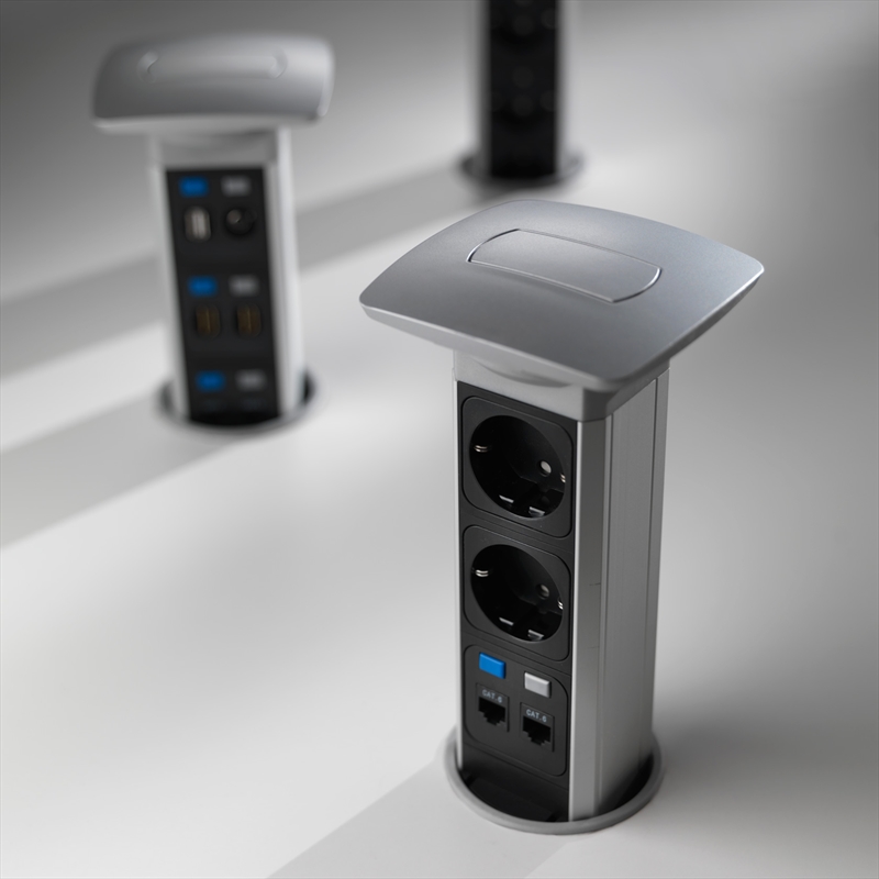 Systeme avec 2 tiroirs électriques, généralement placé dans le plan de travail de table d’une épaisseur min. 2 mm et max. 70 mm (trou de montage diametre 80mm). Le systeme se déploie mécaniquement. Le corps du systeme est en aluminium.