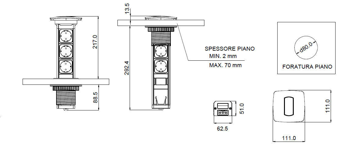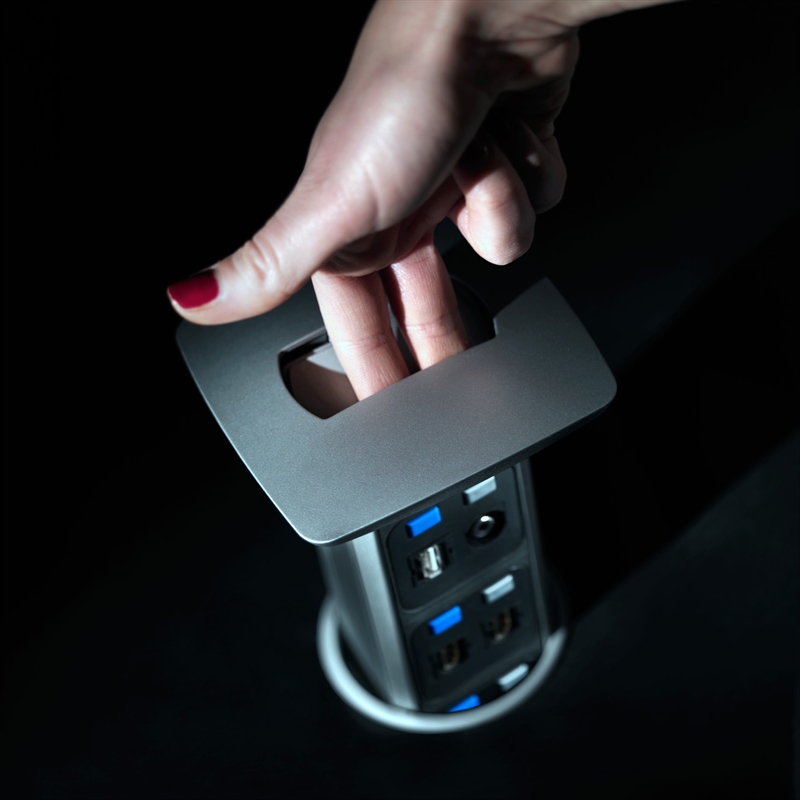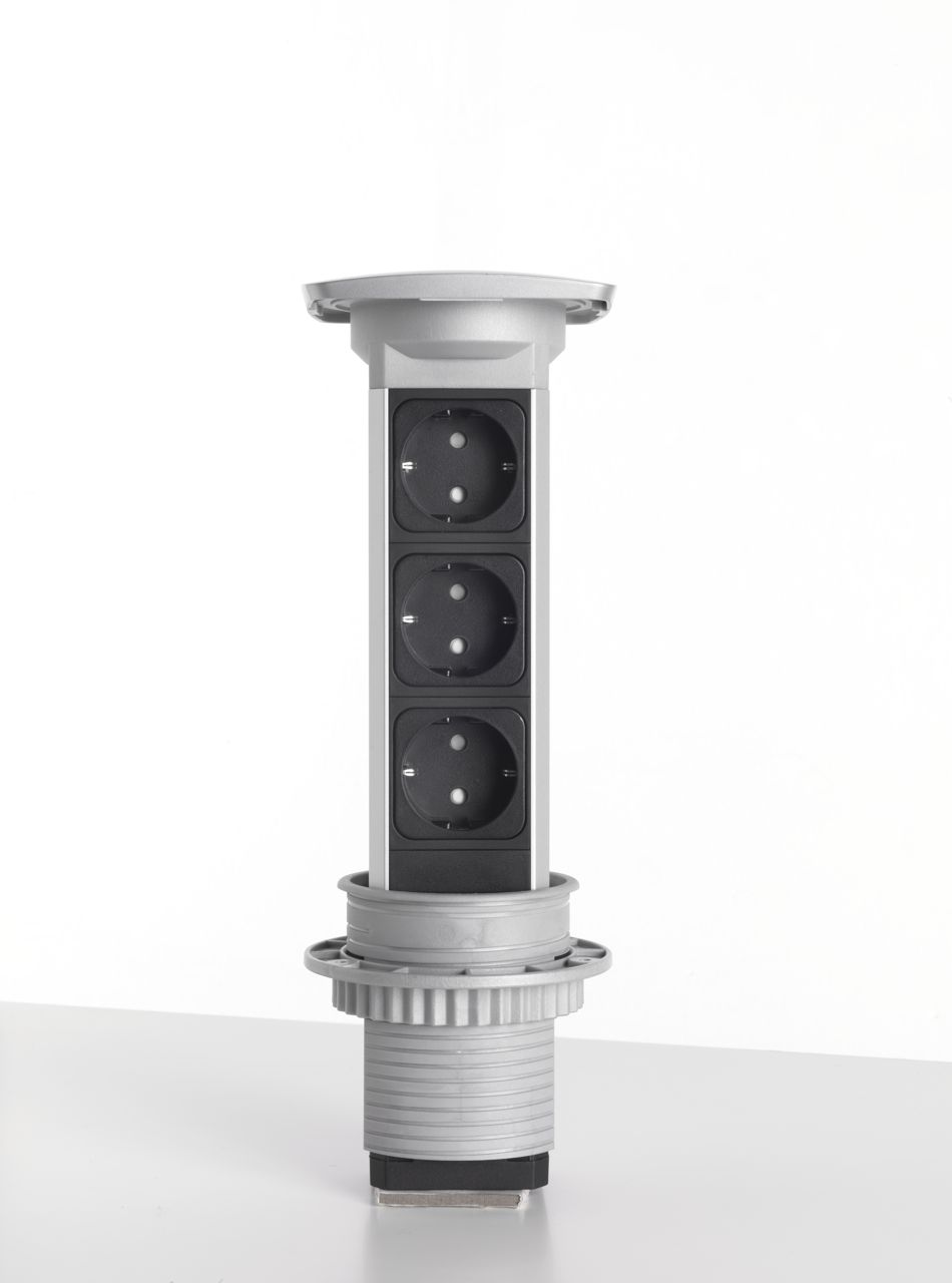 Systeme avec 3 tiroirs électriques, généralement installé dans un plan de travail d'épaisseur min. 2 mm et max. 70 mm (ouverture de montage diametre 80 mm). Le systeme s'ouvre mécaniquement. Le corps du systeme est en aluminium.