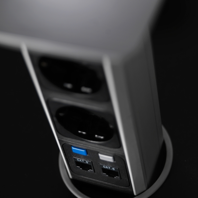 Systeme avec 3 prises électriques et 2 prises de données (RJ45 cat.6), généralement installé dans un plateau de table d’une épaisseur min. 2 mm et max. 70 mm (diametre du trou de montage 80 mm). Le systeme se déploie mécaniquement. Le corps du systeme est en aluminium.