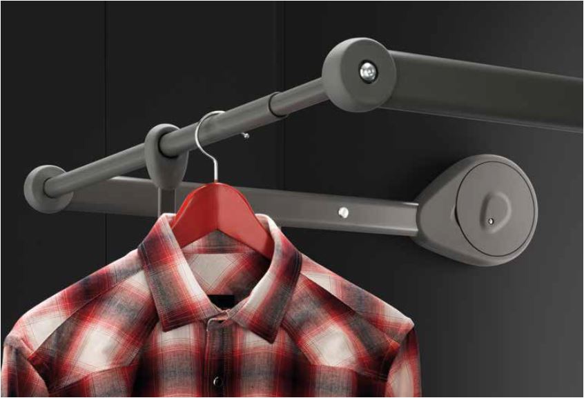 Tringle de penderie rabattable pour corps avec dimensions intérieures 750-1250mm. Profondeur du bras 168mm, hauteur 806mm. Capacité 12kg. Finition grise.