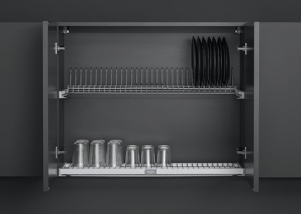 Égouttoir pour armoires hautes - pour corps de 600 mm de largeur • avec réglage de la profondeur (283/391) • cadre en aluminium, fil chromé • bol d’égouttage en PVC