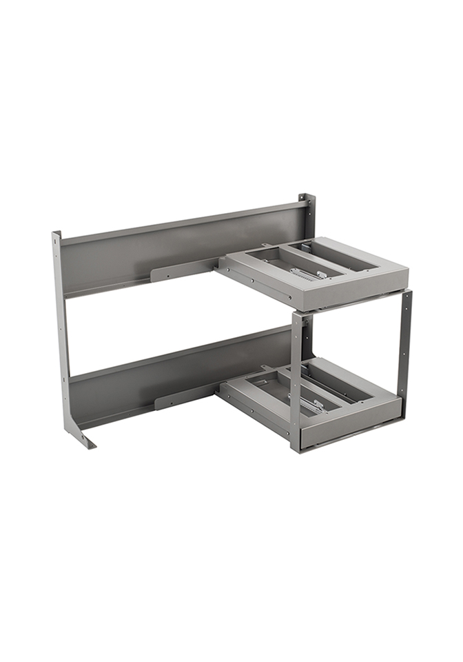 Fly Box est une solution innovante pour armoire d’angle, dans laquelle les compartiments disposés en enfilade peuvent etre extraits d’un seul geste. Grâce a son systeme de guidage, l’étagere arriere, placée dans l’angle, s’aligne automatiquement afin que les deux étageres soient completement sorties de l’armoire basse. Ce design spécifique optimise l’utilisation de l’espace de rangement et facilite l’acces a tous les articles. La charge maximale est de 25 kg par étagere.