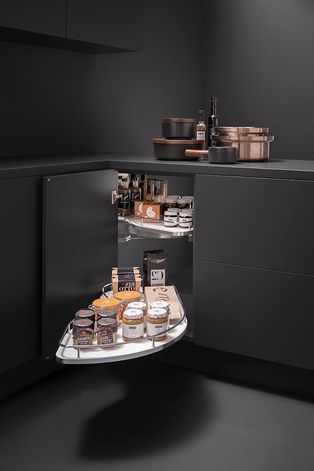 Ensemble d'étageres coulissantes pour corps d'angle a partir de 900mm. Pour angle droit. L'ensemble comprend 2 pcs, étageres avec un reling. Structure télescopique porteuse sous le code 461727. Les dimensions de montage et les croquis sont orientés sur la variante DROITE. Capacité de charge de chaque panier 20 kg.
