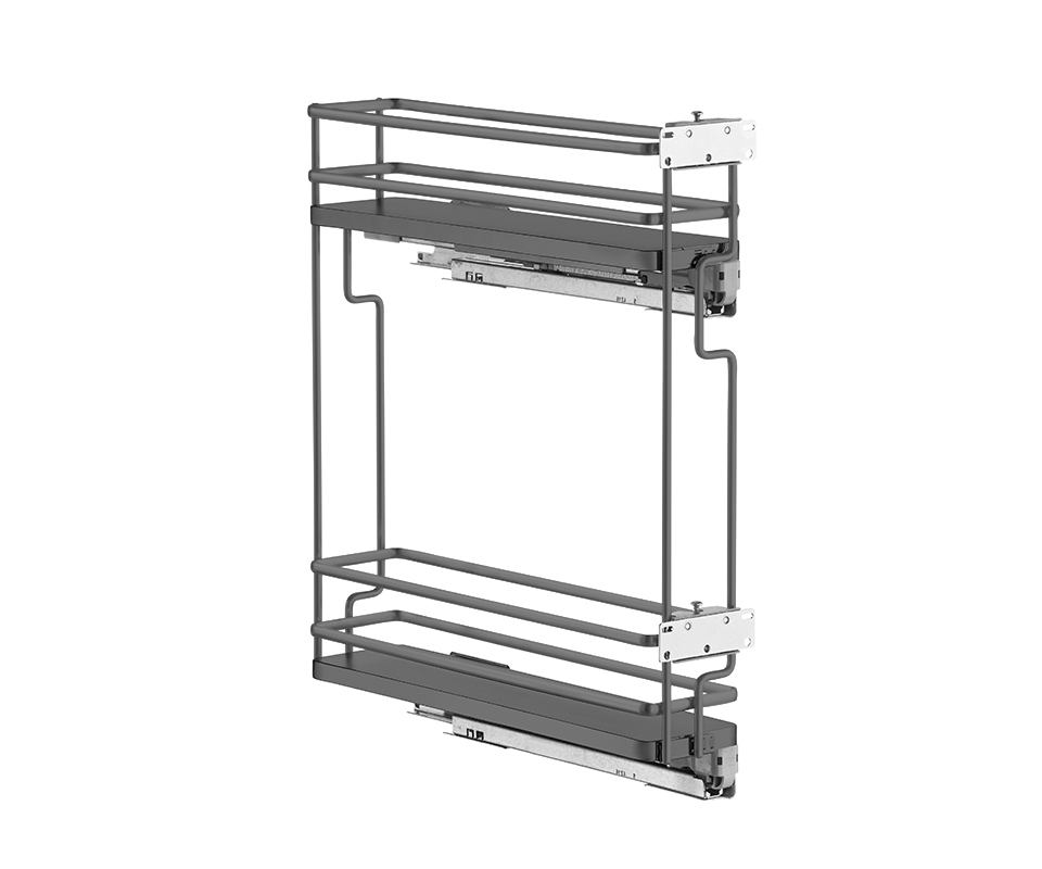 Doppio panier latéral de la gamme Galaxy pour corps de 150 mm. Fil ovale, anthracite, avec fond plein. Montage sur le côté droit du corps. Fourniture incluant la fixation frontale avec réglage du panneau en trois directions. Coulisse a sortie totale avec amortissement cachée.