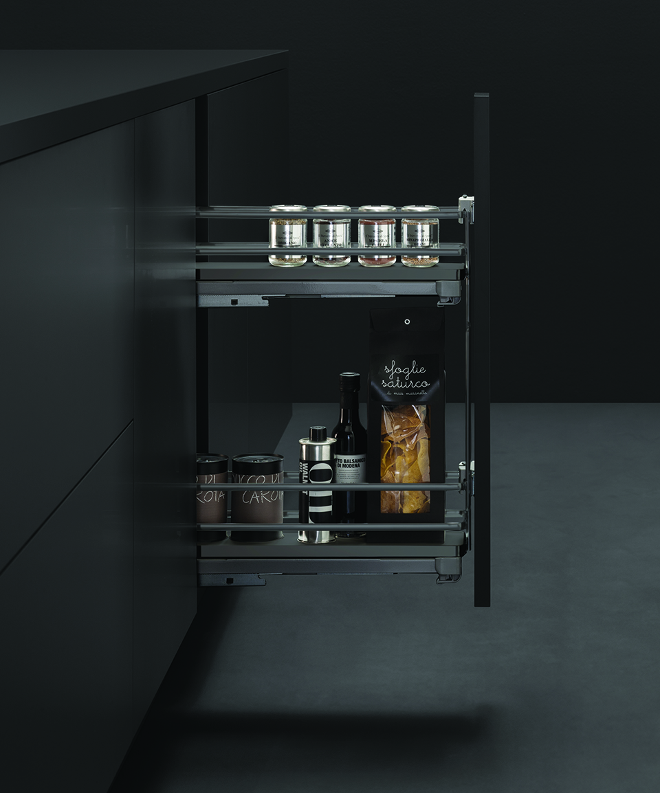 Double panier latéral de la gamme Galaxy pour corps 150 mm. Fil oval, anthracite avec fond plein. Montage sur le côté gauche du corps. Inclus dans l'emballage la fixation frontale avec réglage de la façade dans trois directions. Coulisse a sortie totale avec amortissement cachée