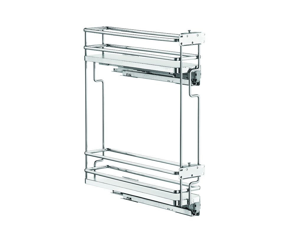 Double panier latéral de la série Galaxy pour corps de 150 mm. Fil ovale chromé avec fond plein blanc. Montage sur le côté droit du corps. Inclus dans l'emballage fixation avant avec réglage du panneau dans trois directions. Coulisse a sortie totale avec amortissement dissimulée.