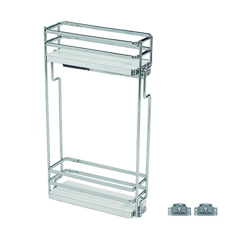 Double panier latéral peu profond de la gamme Galaxy pour armoires hautes ou de salle de bain. Pour une largeur de corps de 150 mm et une profondeur nette minimale de 300 mm. Fil ovale chromé avec fond plein blanc. Montage sur le côté droit du corps. Fourniture avec fixation frontale réglable en 3 directions. Coulisse a sortie totale avec amortissement dissimulée.