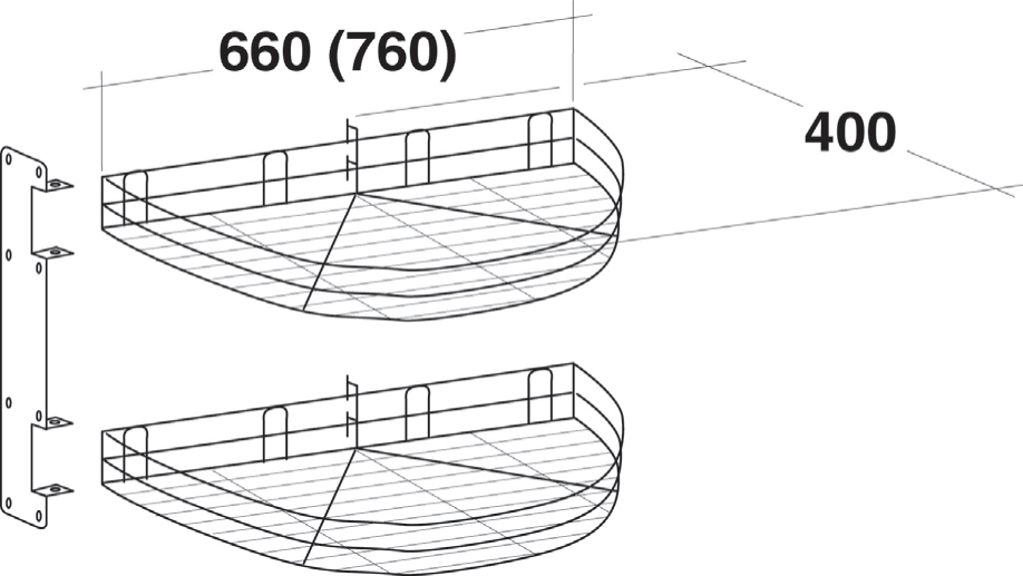Le produit permet une meilleure utilisation de l’espace dans les armoires d’angle de mobilier de cuisine. Finition chrome. Comprend deux paniers demi-lune, un dispositif de suspension, une poignée en plastique pour le panier inférieur, 2x vis a bois. Largeur : 760 mm