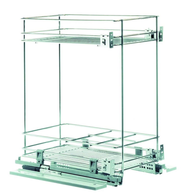 Panier métallique avec deux étageres pour armoire 300mm, avec séparateur pour bouteilles. Sortie totale avec amortisseur (Hettich) réversible droite/gauche. Dimensions : h470xv520xš264. L’emballage contient également 4 supports de façade.