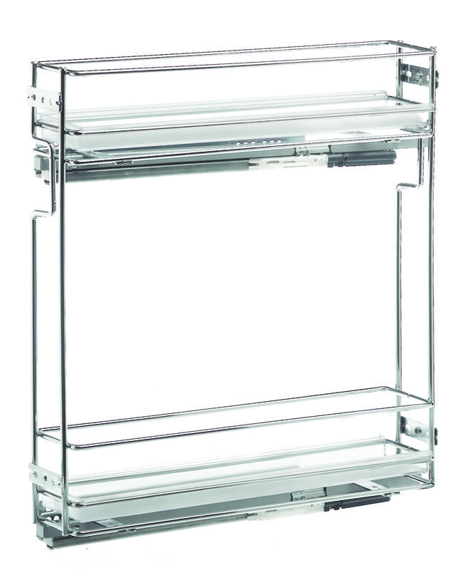 Double panier latéral coulissant gauche avec bols en plastique. Tiroir coulissant Hettich. Dimensions : L107xP473xH510. Convient pour des récipients ouverts, facile a essuyer, sans risque de taches permanentes ni de "ronds".