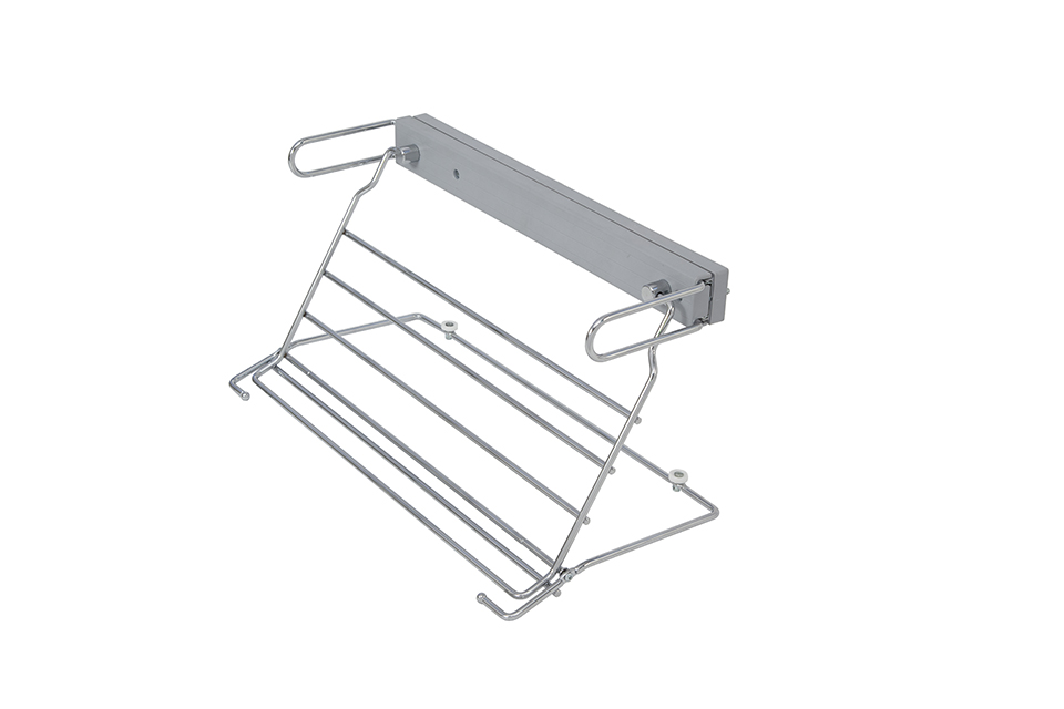 Porte-pantalons et porte-jupes coulissant et abattant. Glissiere a billes a extension totale avec rappel (sans amortissement). Dimensions : 260x500x260 mm. Couleur : aluminium/chrome.