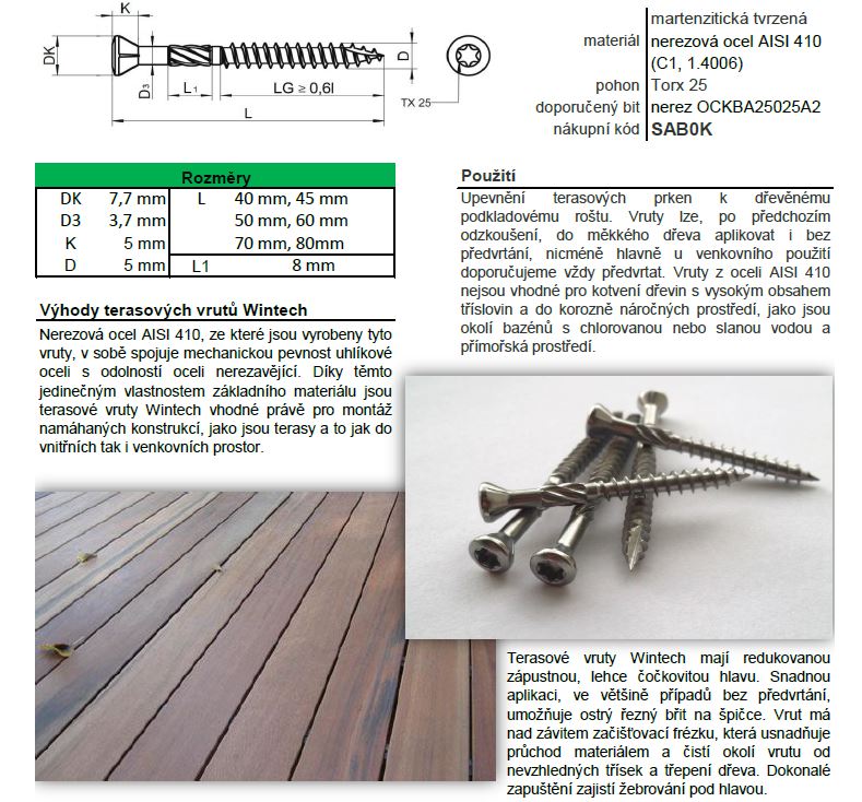 Caractéristiques principales : Tete renforcée assurant une plus grande résistance mécanique. Arete de coupe tranchante a la pointe permettant une application sans pré-perçage. Fraiseuse de finition au milieu de la vis a bois. Roulage sous la tete. Tete affleurante réduite, légerement convexe. Acier inoxydable martensitique trempé AISI 410. Cette vis de terrasse est fabriquée en acier AISI 410. Cela signifie qu’elle est solide et résistante a la corrosion, donc adaptée a une utilisation en extérieur. Elle possede une tete affleurante prononcée, légerement convexe, avec un rainurage sur la face inférieure. L’entraînement TORX sur toute la gamme de dimensions permet des couples de serrage élevés. La vis a un filetage partiel avec fraiseuse et arete de coupe. Le corps massif de la vis la destine a un usage polyvalent. Elle est particulierement adaptée pour la réalisation de terrasses, façades, passerelles, tonnelles et autres constructions en bois.