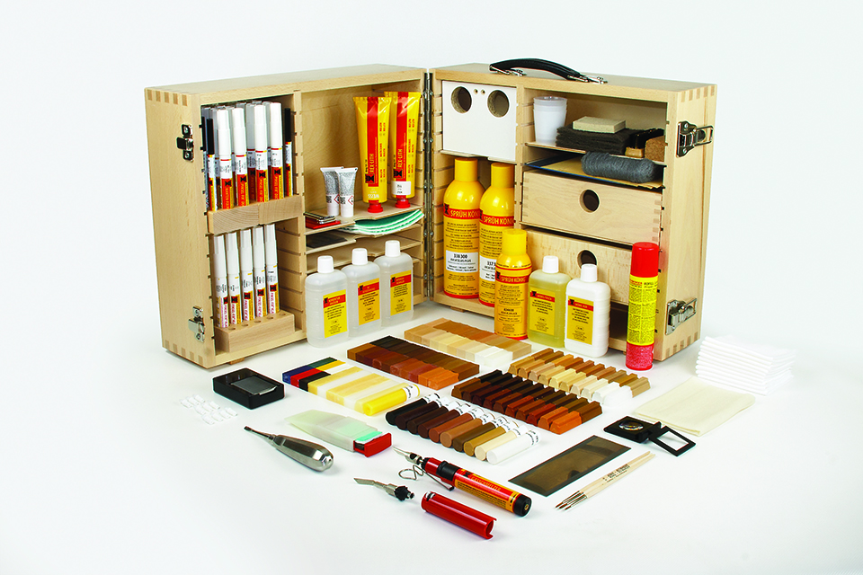 Contenu : 14173A 20 pcs x 4 cm, cire dure, série 73A 205112 10 pcs, fix structurant, série 112 288000 4 pcs, feutre avec pointe pinceau, couleurs de base 337300 1 pc, vernis de retouche Ansatzlos, 400 ml, mat 14173B 20 pcs x 4 cm, cire dure, série 73B 144500 1 pc, ensemble de mastics différents 268000 5 pcs, feutre avec vernis incolore, différents brillants 14073B 20 pcs x 4 cm, cire molle, série 73B 14073A 20 pcs x 4 cm, cire molle, série 73A 150002 1 pc, ensemble de mastics Rex-Lith DUO, bois/blanc 288000 11 pcs, feutre avec pointe pinceau 130714 10 pcs x 8 cm, cire tres molle, série 714 Réf. Produit Description 243000 5 pcs, feutre de retouche, tons blanc-gris 161149 1 pc, spatule pour mastics cireux 162000 10 pcs, films transparents 406000 1 pc, jauge en acier 418000 1 pc, liege abrasif 422000 10 pcs, t-shirt nettoyant en coton, format A5 419000 1 pc, prisme abrasif en feutre 430001 1 pc, pinceau en poil de martre vermillon, taille 1 407000 1 pc, petite brosse A34400 1 pc, vernis de retouche Aqua, 150 ml, semi-mat 411000 1 pc, chiffon microfibre abrasif et polissant 163000 1 pc, rabot pour vernis 165000 1 pc, arrondisseur d’angles 338300 1 pc, vernis de retouche Ansatzlos, 400 ml, semi-mat 413600 1 pc, laine d’acier abrasive 434000 1 pc, loupe 439001 1 pc, chalumeau a gaz 439440 1 pc, pointe de rechange incurvée pour chalumeau 507000 1 pc, nettoyant intense, 150 ml 542000 1 pc, produit brillant pour meubles, 150 ml 641120 3 pcs, gobelets mélangeurs 543000 1 pc, raviveur pour meubles, 150 ml 609003 3 pcs, toile abrasive grossiere, 10x6 cm 603095 1 pc, palette de mélange 710000 1 pc, diluant nitro, 150 ml 439018 1 pc, recharge gaz, 90 ml 609002 1 pc, ensemble de papiers abrasifs 711000 1 pc, dégraissant, 150 ml 430002 2 pcs, pinceau en poil de martre vermillon, taille 2 161149 1 pc, spatule pour mastics cireux 426501 5 pcs, chiffon 655500 1 pc, eau abrasive, 150 ml