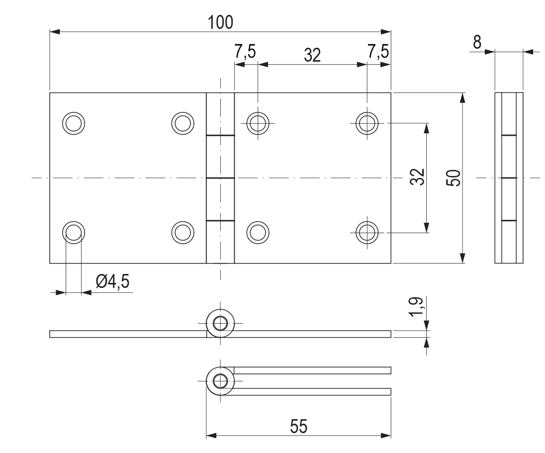 charniere 50x50mm, en position ouverte 100x50mm. Sur chaque moitié, il y a 4 trous de diametre 7mm, l'entraxe entre les trous est de 32mm, le diametre extérieur de la goupille et l'épaisseur de la charniere en position fermée est de 8mm. Épaisseur de la tôle 1,8mm.